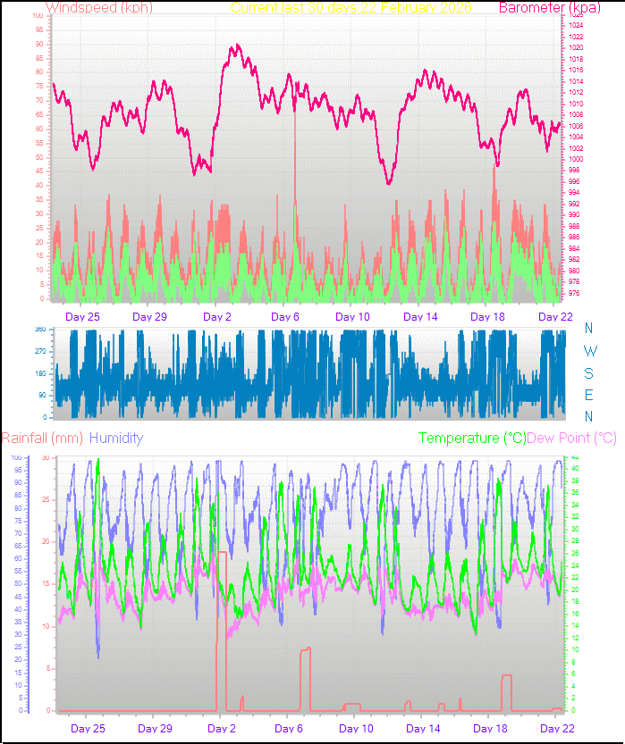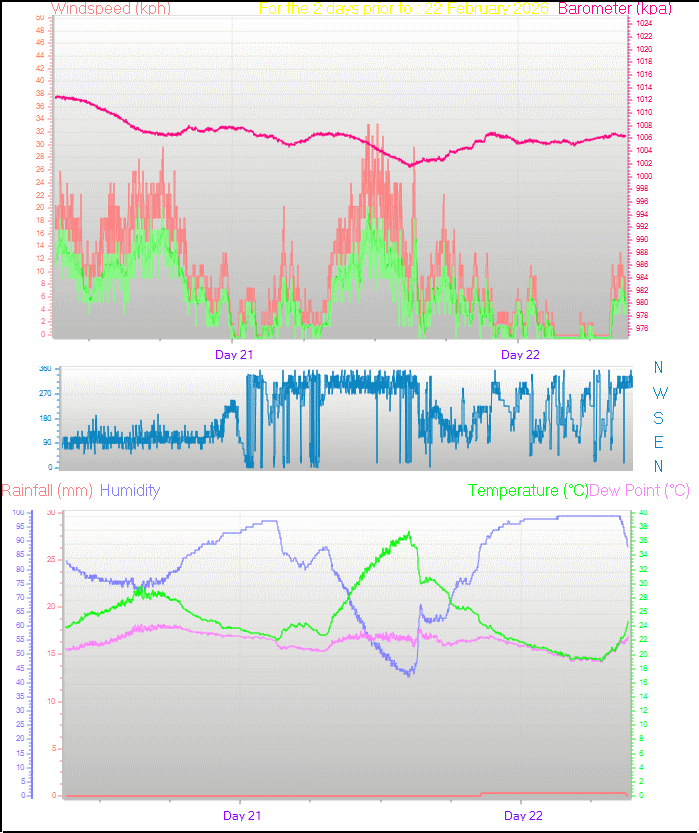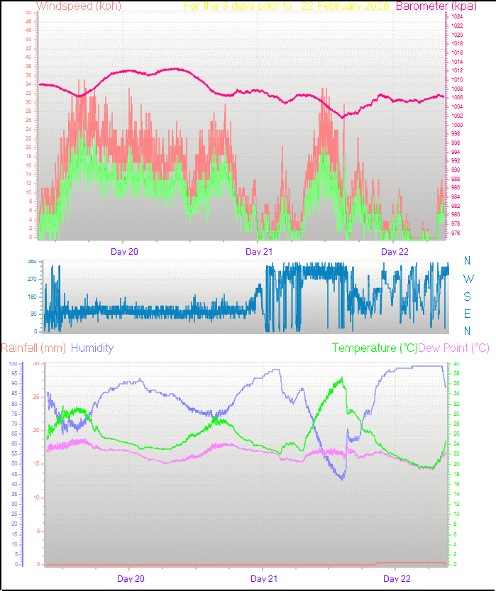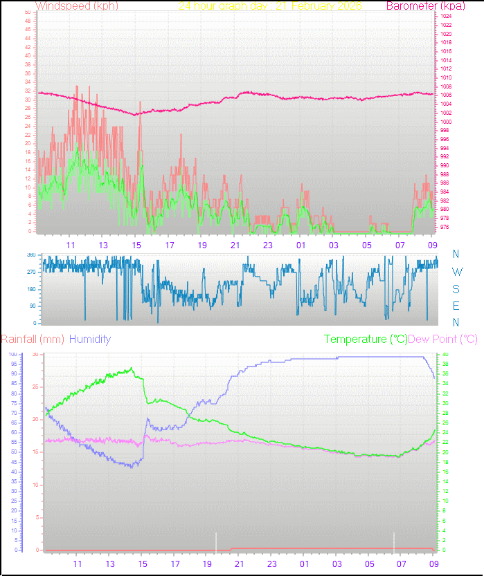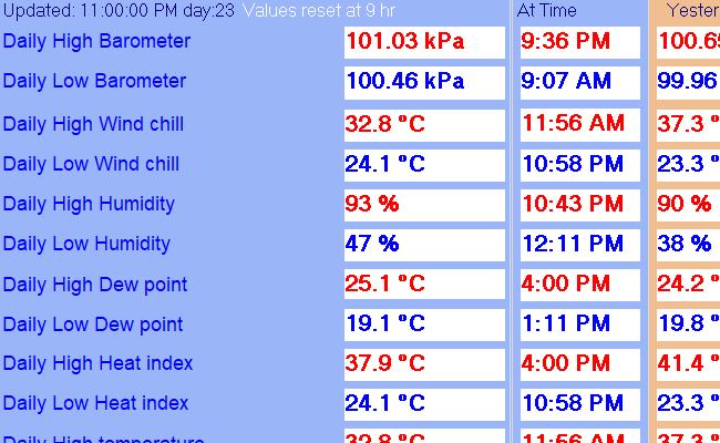Daily high pressure 101.1 kPa Daily low pressure 100.5 kPa Daily low windchill 11.8°C Daily high heat index 15.9°C Daily high gust speed 28.1 kmh N Daily high average speed 20.9 kmh SSW